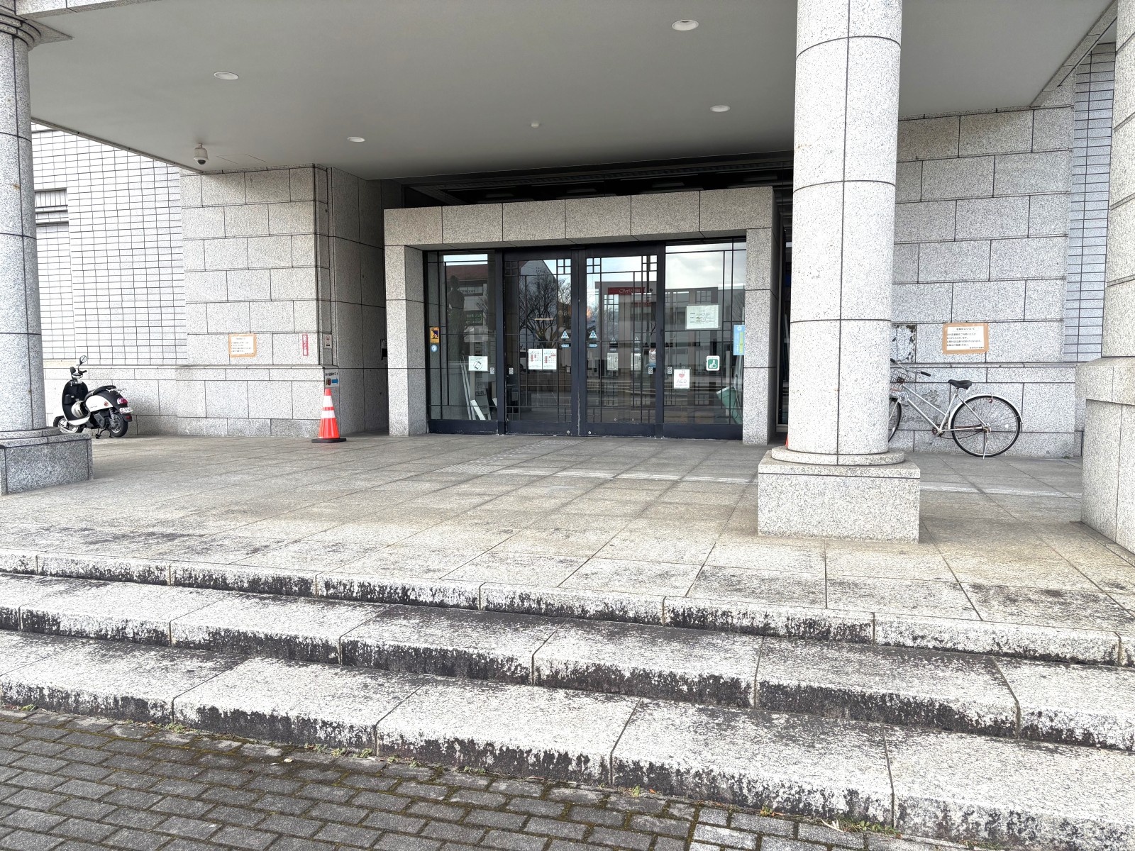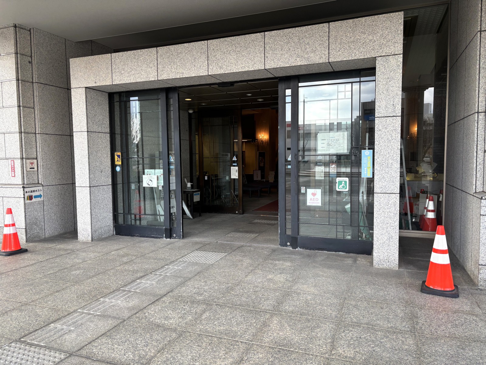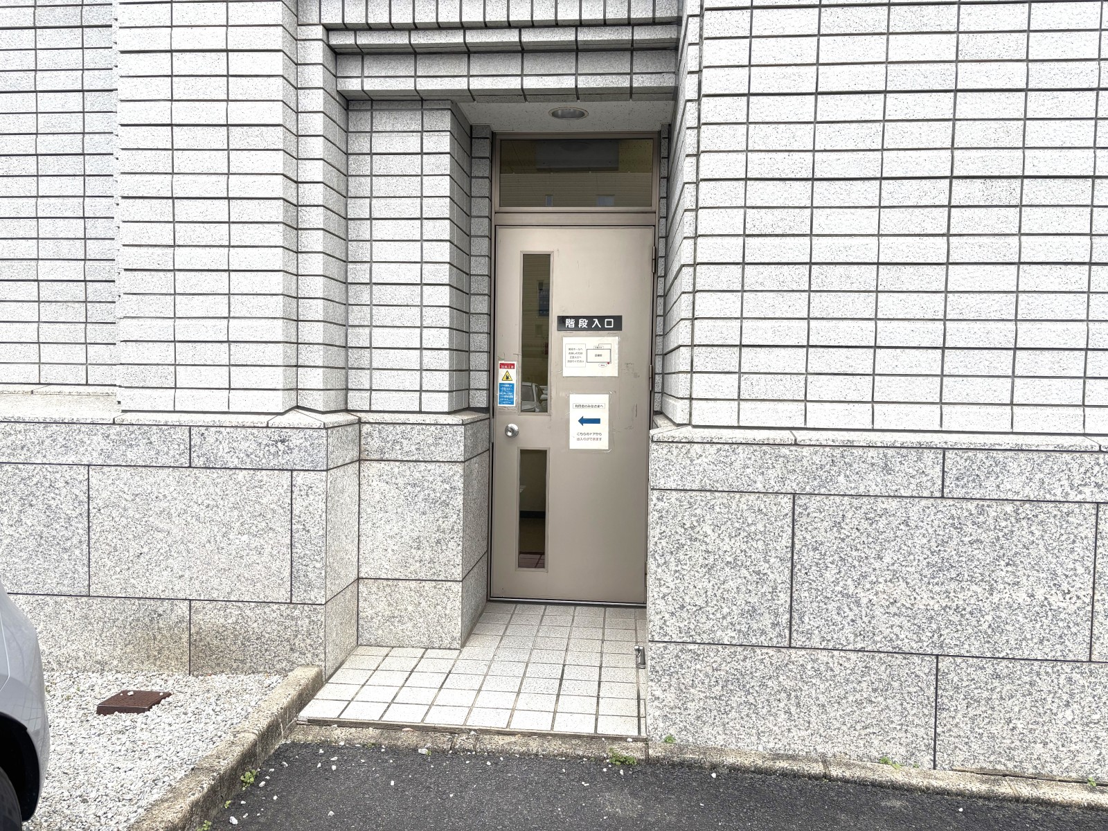 西出入口からは階段のみ。北出入口は1階ホールへとつながっています。